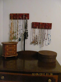 That was posted by the Fabric Market. This idea inspired me to create a holder for the necklaces my aunt makes me. I found some pieces of wood in the basement (I guess Colin was right, they would come in handy sometime hahaha) Some fabric pieces, small hooks, staple gun and the wall hanging things. I'm not sure what it is called.